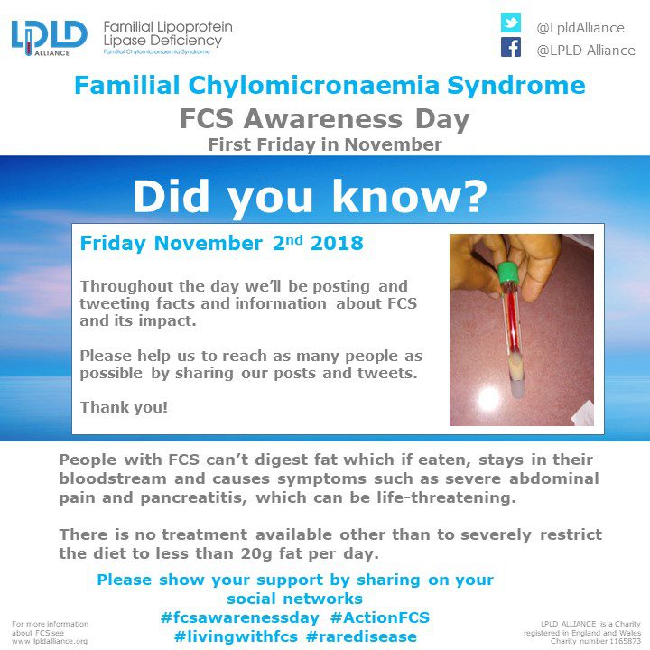 Today 2nd November is Familial Chylomicronaemia Syndrome (FCS) Awareness Day. The LPLD Alliance are raising awareness of FCS by tweeting facts and information about FCS and its impact.