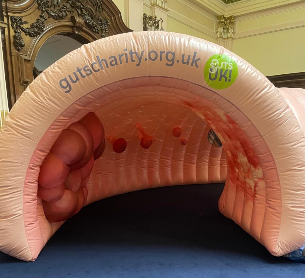 Our research shows that 58% of people are embarrassed to talk about their digestive condition or symptoms. 51% of people delay seeking advice for their symptoms for over 6 months. We empower people to seek help. One of the wonderful ways we do this is by taking our wonderful, giant, inflatable colon, “Colin”, on the road!
