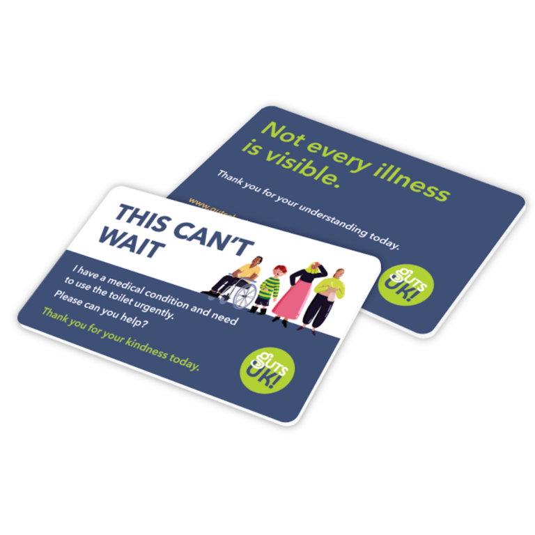 You can also order one of our “This Can’t Wait” cards if you live in the UK. These are designed with people in mind who are living with a digestive condition or symptoms. The cards are small, wallet-sized and can be shown to people in public spaces to let them know that you need urgent access to toilet facilities.