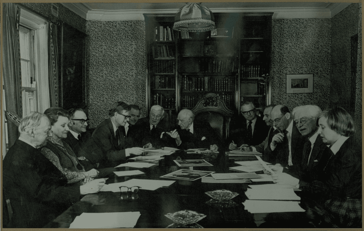Clockwise from left: Sir Francis Avery Jones, Mrs. T. Hunt, Prof. Michael Hobsley, Christopher Hurst, Dr. Richard Tonkin, Dr. William Mann, Dr. Thomas Hunt, Major H. Mitchell, Lionel Goldhill, Dr. Martin Sarner, Prof. Bryan Brooke, Mrs. W. Mann