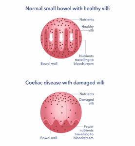 In some people with coeliac disease, gluten-induced damage leads to the villi being almost completely flat. This is called villous atrophy. This reduces the bowel’s surface area, meaning there is a reduced absorption of nutrients. This can lead to nutrient deficiencies in the body. Avoiding gluten allows the villi to recover over time. However, coeliac disease remains a lifelong condition and requires a lifelong gluten-free diet to keep it treated.