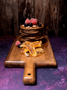 You could use the cooked bananas to give flavour as they are sweet and a drizzle of maple or golden syrup if you want addition sweetness. Or an alternative is sweetener with berries if you are avoiding too much sugar. But pancake day comes around once a year so most people can have a treat!