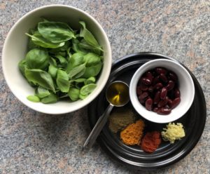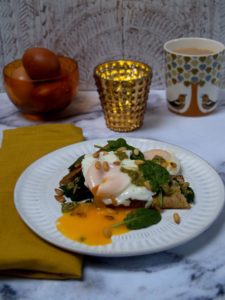Want to zing up your breakfast a bit? Make in advance this alternative to hummus / basil pesto that contains no garlic, and also six thin pancakes (stack on top of each other to keep them warm). Wilted spinach and egg are a perfect filling and two of these warming, tasty bundles will set you up with an iron boost of 5 mg. Two per person, and if you have a bigger appetite, a third one sweet?