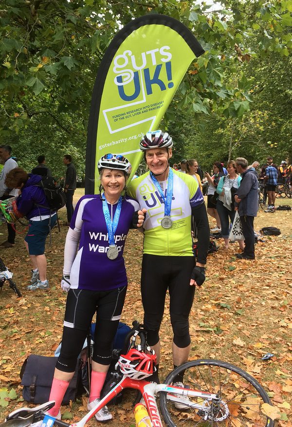 My name is Sue Tusting and I rode the Ride London in 2018 for Guts UK, to raise funds and awareness for pancreatitis. I started cycling when I was 50 and soon realised what I had been missing for the past 30 years! I quickly became quite an enthusiastic cyclist and have ticked off John O’Groats to Lands End (nine days!), London to Paris (three days) as well as a few of the classic Alpine cols and some time trialling. But it all started to go wrong for me on the very first Ride London 100 after the Surrey hills when I had a major pancreatic attack. I took a break from cycling but the symptoms returned and I started on my ‘Whipple journey’ (a Whipple procedure is a surgical operation to remove the head of the pancreas). The issues seem to have arisen from my duodenal diverticulum and the ampulla of vater being hidden inside one of the loops! So following a cholysycyectomy, hepaticojejunostomy, three sphincterotomies and five pancreatic stents (13 ERCPS!), which had limited results, I was Whippled on 18th May last year.